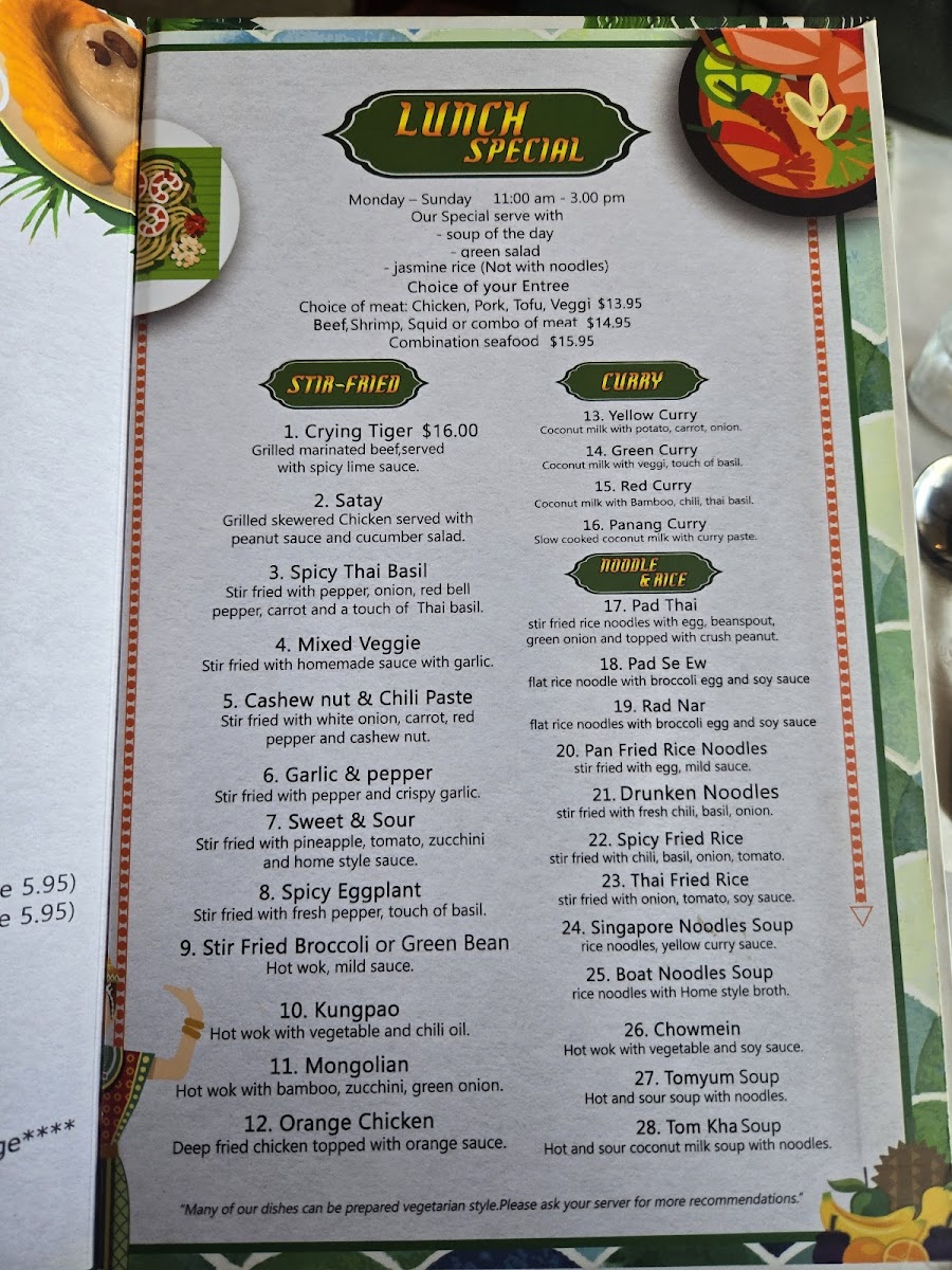 Pad thai was nice, and the glass noodle soup was surprisingly way better than what I expected. However, I tried what my friend ordered and it blew my mind away. Crying Tiger was the name, I believe. The meat was tender, and I can't really describe in words how good the sauce was. I don't live around here but I would drive all the way here just to get Crying Tiger again.
