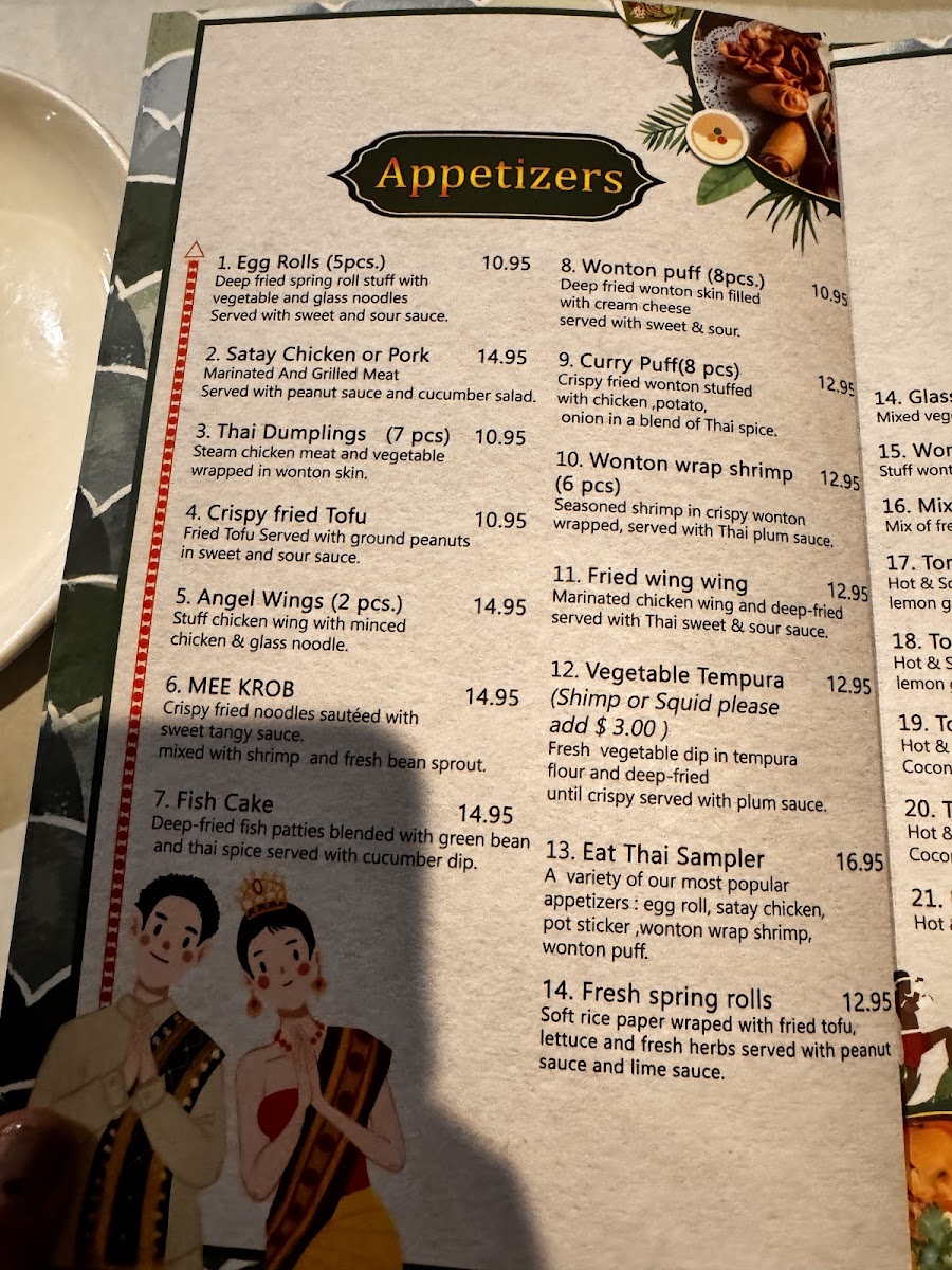 This is one of the best Thai restaurants I have been to. The Drunken Noodle is always our top priority, SUPER DELICIOUS!!! Because they use FRESH ingredients. Usually, I ask for less oil and they did it. The service is also wonderful!!! The Crying Tiger is yummy.......Ask for medium rare. The Thai sampler is also great !!!.....You can taste many kinds of appetizers in 1 order. The Thai ice tea in this restaurant is the best Thai tea compared to other Thai teas in other places. One more thing, the Angel Wings are super big and inexpensive. We ordered Pineapple fried rice for a friend and he said it's delicious!!! We have been a regular going to this restaurant for more than 10 years with those same orders and never get tired of the food.
